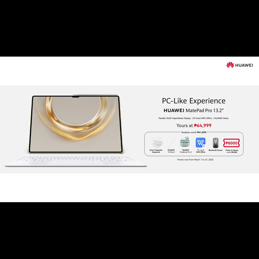 The HUAWEI MatePad Pro 13.2-inch 2025 comes with an exclusive bundle that powers up your productivity worth ₱41,895. This bundle includes a Smart Magnetic Keyboard, HUAWEI 3rd generation M-Pencil, HUAWEI FreeBuds Pro 3, PC-Level WPS Office suite, bluetooth mouse, and trade-in tokens worth PHP 8,000. This offer is available from March 7 to March 31 only.