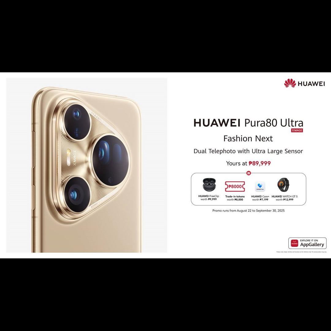 Get exclusive freebies when you purchase the HUAWEI Pura 80 Ultra or Pura 80 Pro. Enjoy a HUAWEI FreeClip, trade-in tokens worth ₱8,000, HUAWEI Care+ worth ₱7,199, and a HUAWEI WATCH GT 5 with the Pura 80 Ultra. For the Pura 80 Pro, receive ₱5,000 trade-in tokens, HUAWEI Care+ worth ₱5,999, and a HUAWEI WATCH GT 5. Promo runs until September 30, 2025.
