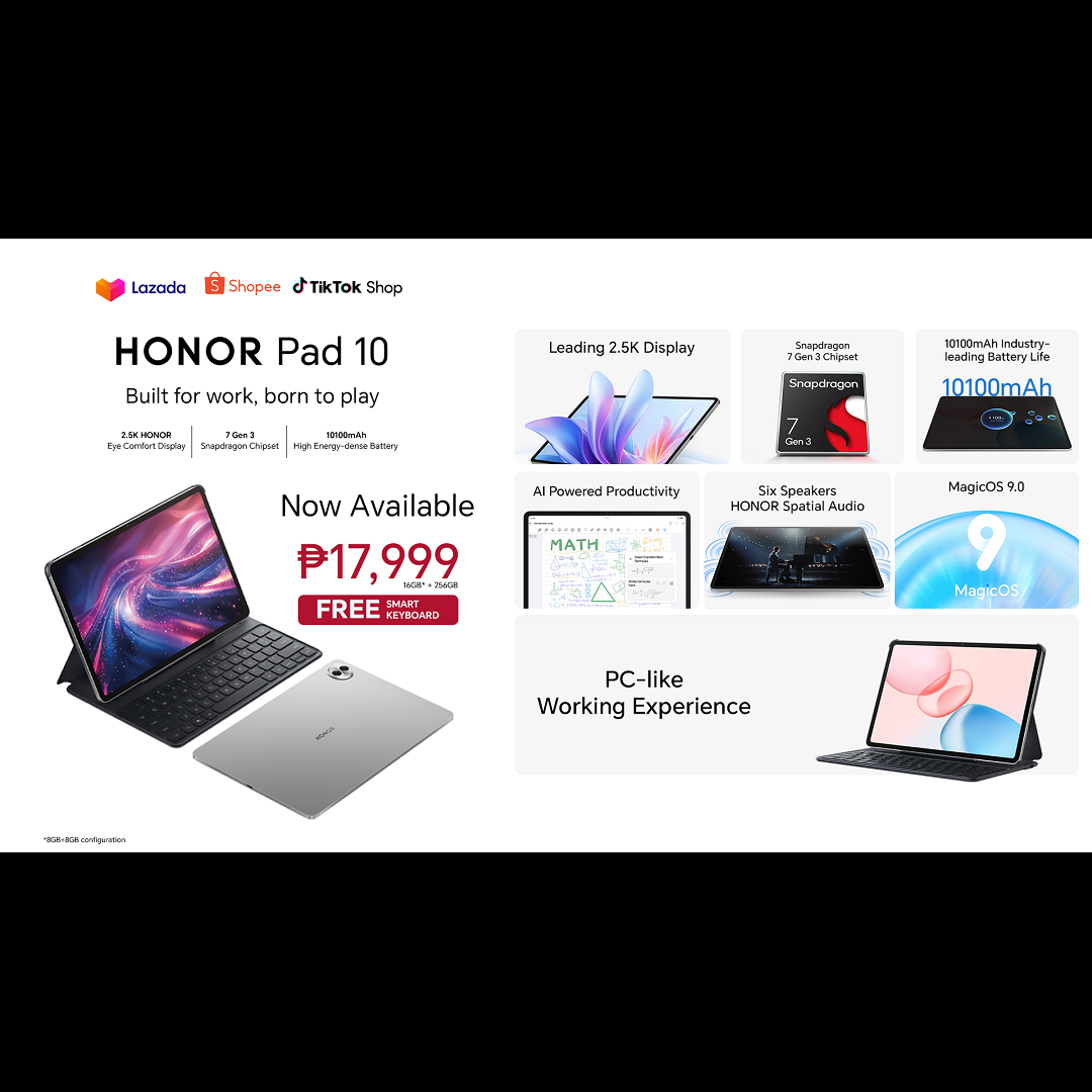 HONOR Pad 10 comes in premium Gray color with FREE HONOR Smart Keyboard and Pencil for only ₱17,999! Get it now at any HONOR Partner and Experience Stores or online via: Shopee, Lazada, or TikTok Shop.