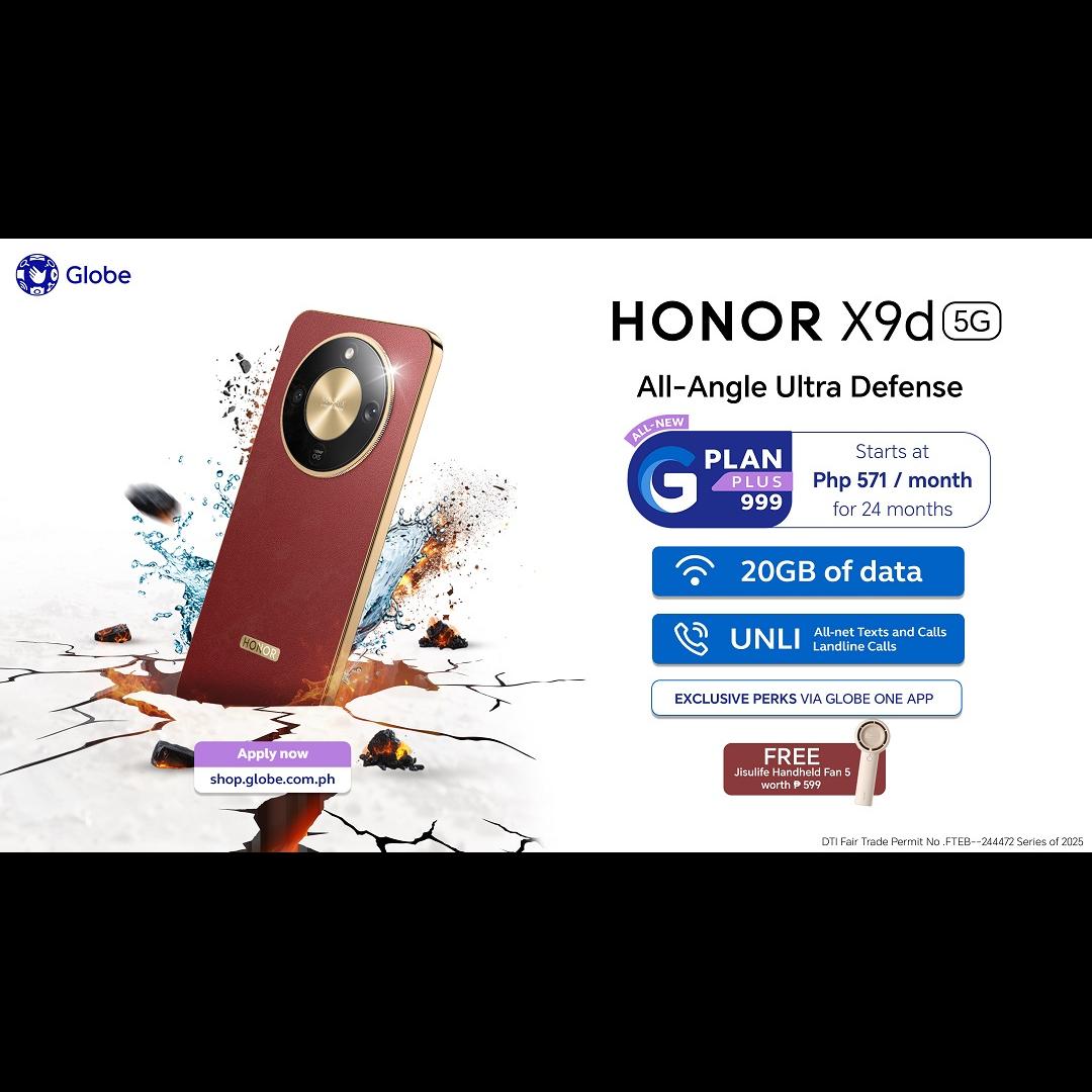 You can now head to participating Globe stores to get #TheToughestPhone, the HONOR X9d 5G, starting with G-Plan Plus 999 and a monthly device bill as low as Php 571. The mobile plan comes with 20GB data, unlimited all-net calls and texts, exclusive perks, and a FREE Jisulife Handheld Fan 5.