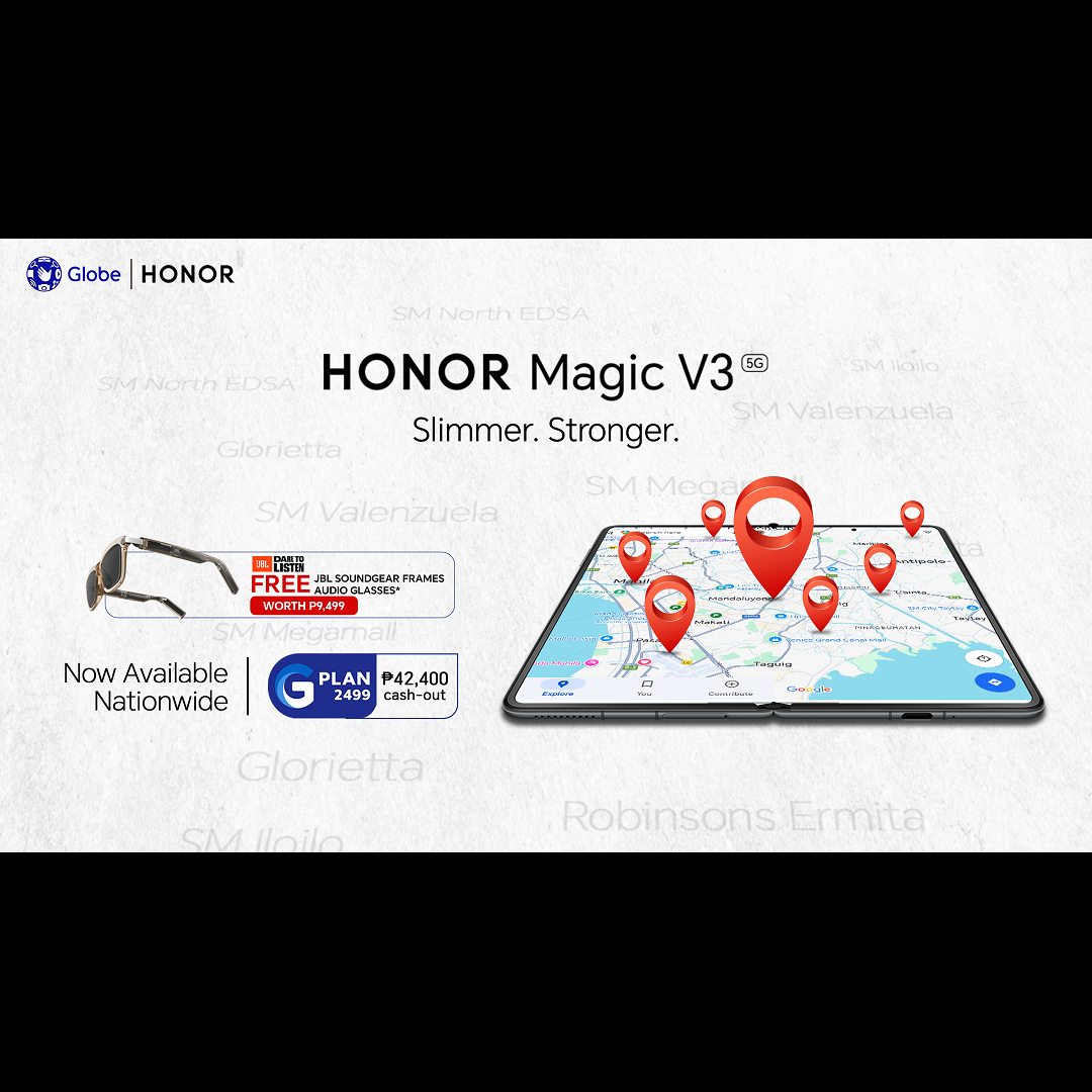 HONOR Magic V3 is now available at Globe Stores in: SM North Edsa, Robinsons Place Ermita, SM Mall Of Asia, SM Megamall, SM Valenzuela, SM Dasmarinas, SM Bacolod, SM City Butuan, SM Ilo-ilo, Glorietta 3 Makati, SM Legazpi, SM Bacoor, SM Southmall, SM Calamba, SM Davao, SM Tuguegarao Downtown, SM Marikina, SM Batangas, SM Urdaneta, SM Cabanatuan, SM Masinag, GLOBE Iconic BGC, SM Sta. Rosa, SM Fairview, Robinsons Place Dumaguete, Limketkai, and Robinsons Tacloban.