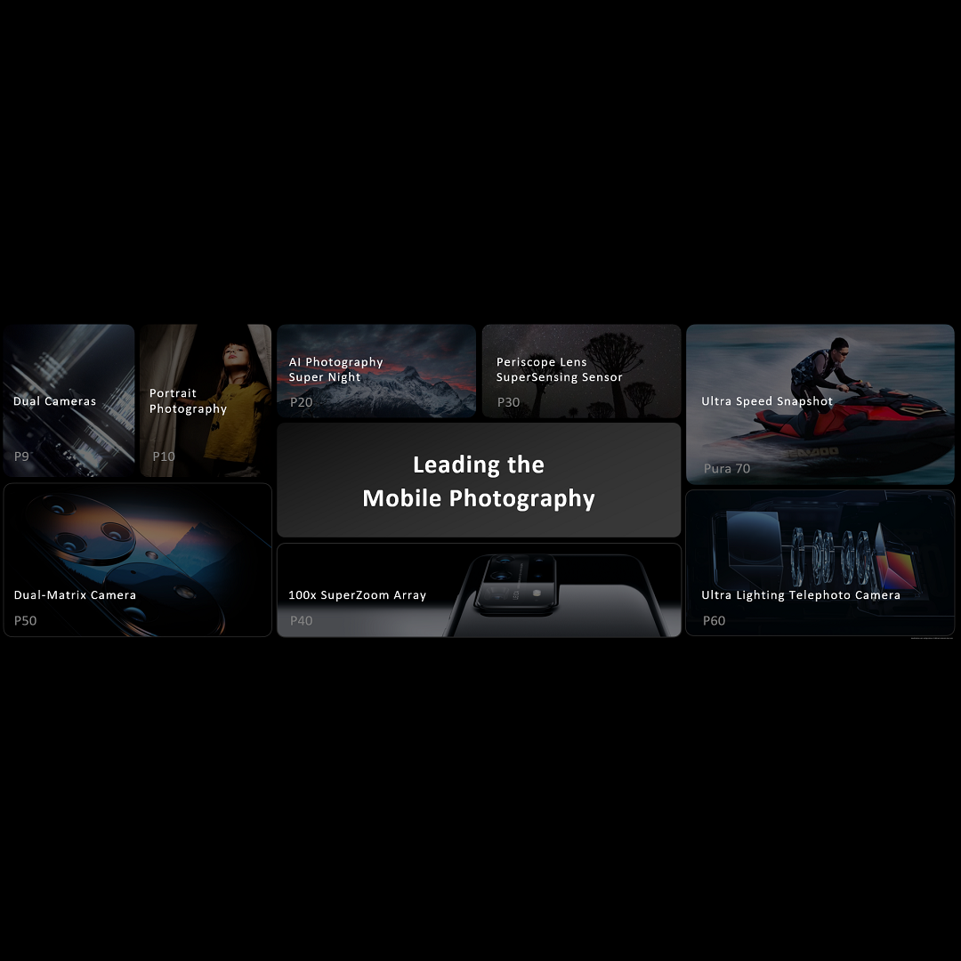 The series quickly evolved into a symbol of mobile photography innovation with landmark features such as the HUAWEI P9’s mono-color dual-lens technology, the HUAWEI P20’s revolutionary Super Night Mode, the HUAWEI P30’s pioneering Periscope Tele Lens, the HUAWEI P40’s unmatched 100x SuperZoom Array, the HUAWEI P50’s 10-Channel Multi-Spectrum Sensor, and the HUAWEI P60’s Ultra Lighting Macro Telephoto Camera. Each generation reaffirms the series’ position as a leading figure in the evolution of mobile photography, setting new benchmarks and propelling the future of imaging innovation.