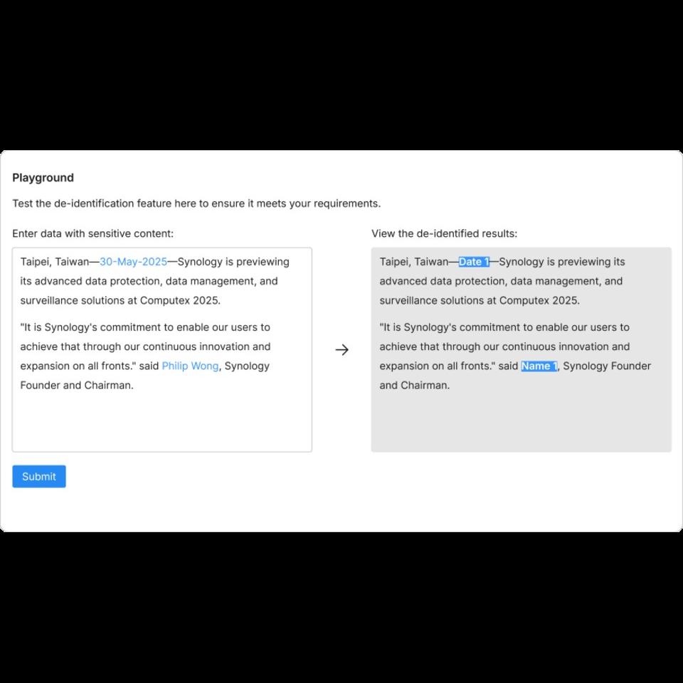 Moreover, the built-in de-identification capabilities automatically redact sensitive information based on company policies before any data is transmitted to third-party AI services. All AI usage activities are fully recorded with transaction and admin logs for auditing purposes.