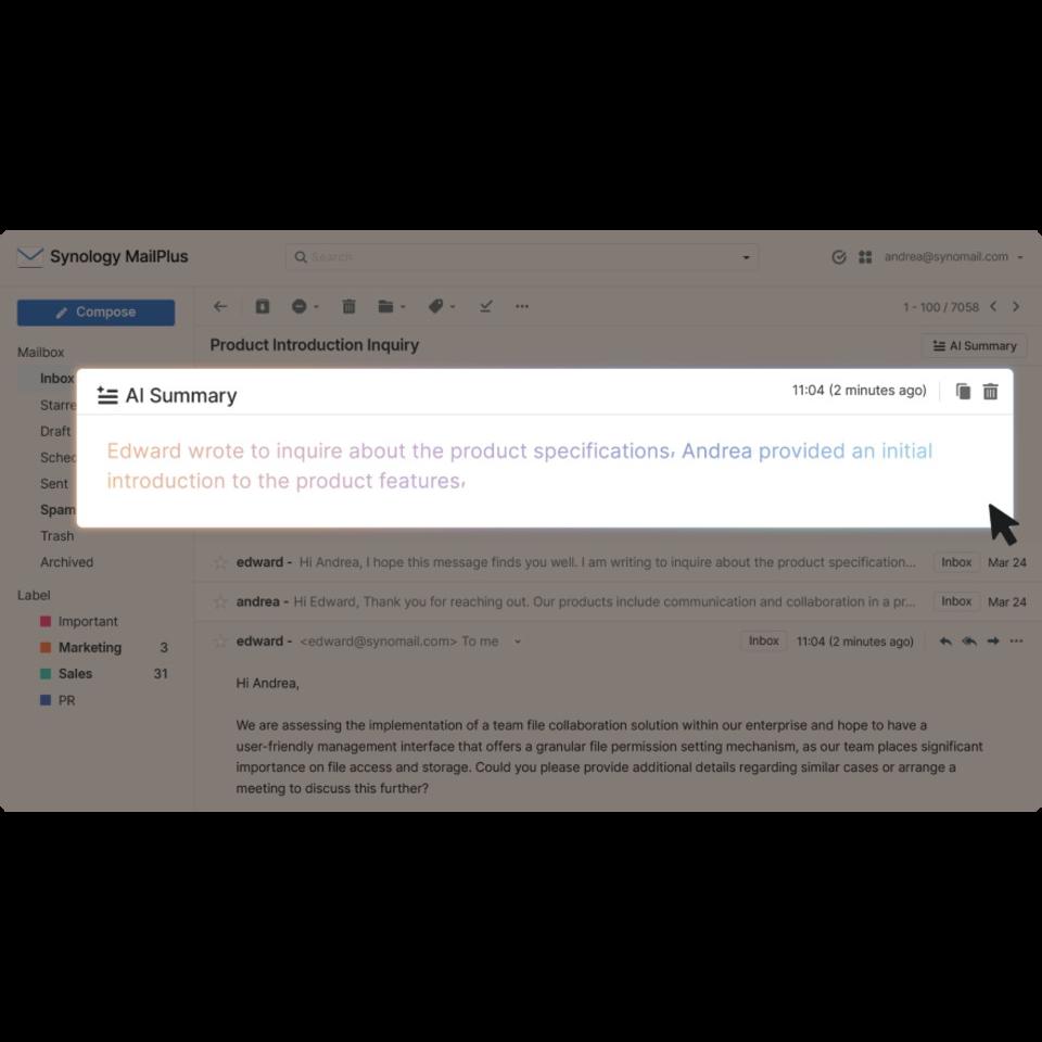 Synology MailPlus leverages generative AI to help users efficiently handle and respond to large volumes of emails. MailPlus AI can summarize lengthy email threads and suggest actionable follow-ups, accelerating email triage. It also enables context-aware, one-click smart replies and can reference previous emails or templates to help users craft precise and professional responses.