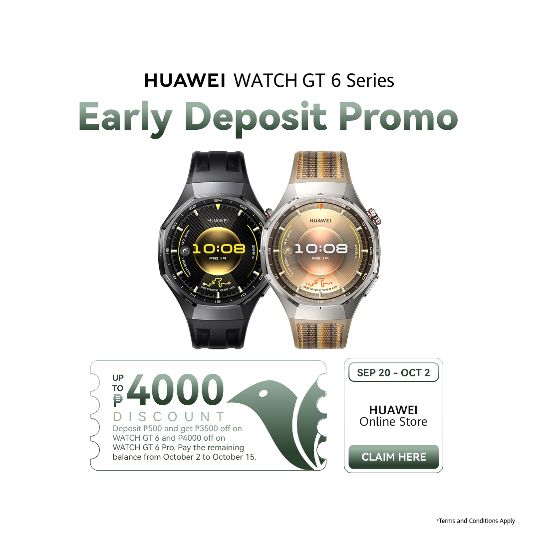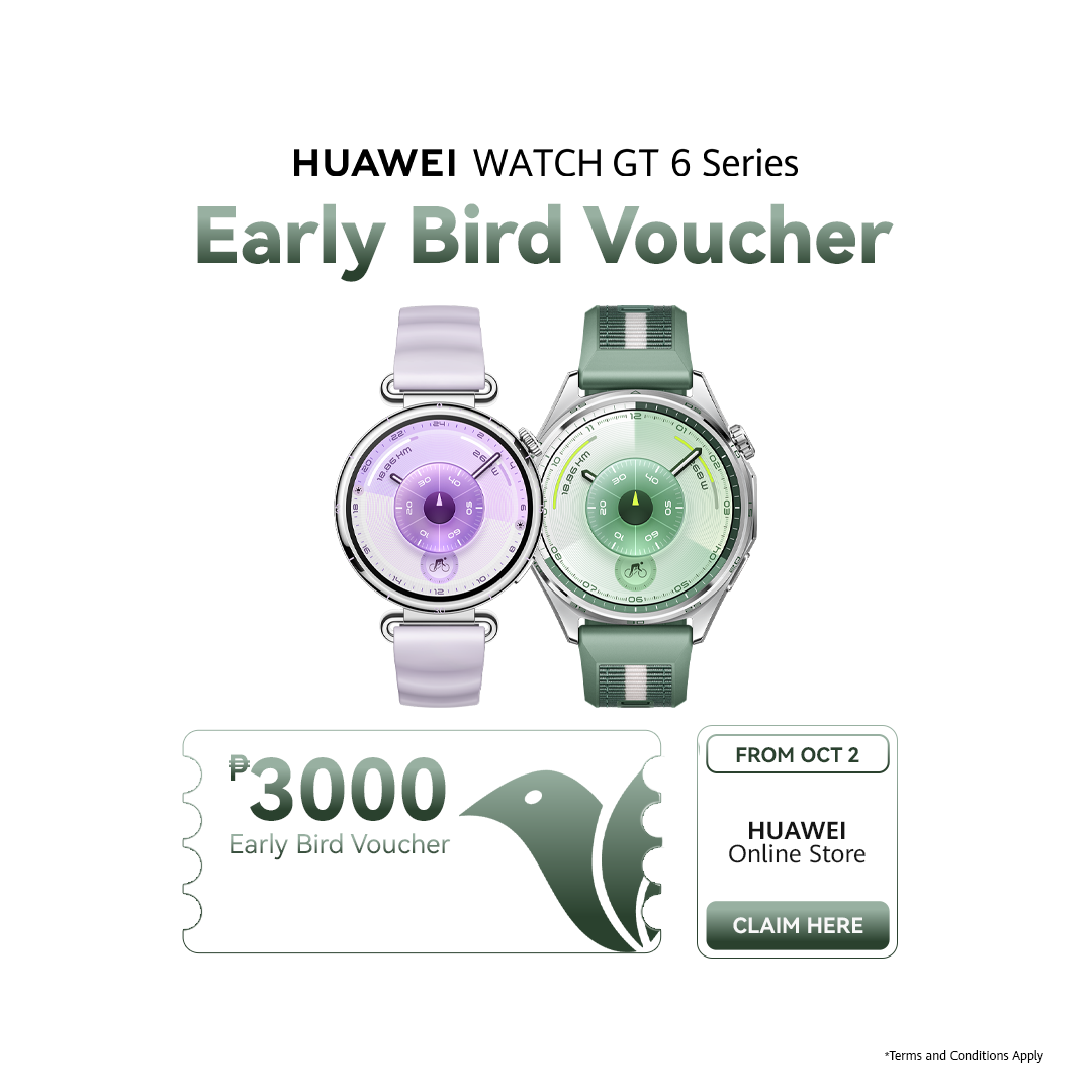 HUAWEI is rolling out exciting early bird offers for the WATCH GT 6 Series. On the HUAWEI Online Store, customers can pay a ₱500 deposit from September 20, 10:00 AM until October 2, 5:59 PM to secure big discounts—₱3,500 off for the WATCH GT 6 and ₱4,000 off for the WATCH GT 6 Pro. Balance payments may be completed from October 2, 6:00 PM until October 15, 11:59 PM. Shoppers can also look forward to a special ₱3,000 early bird voucher, available starting October 2 at 6:00 PM.