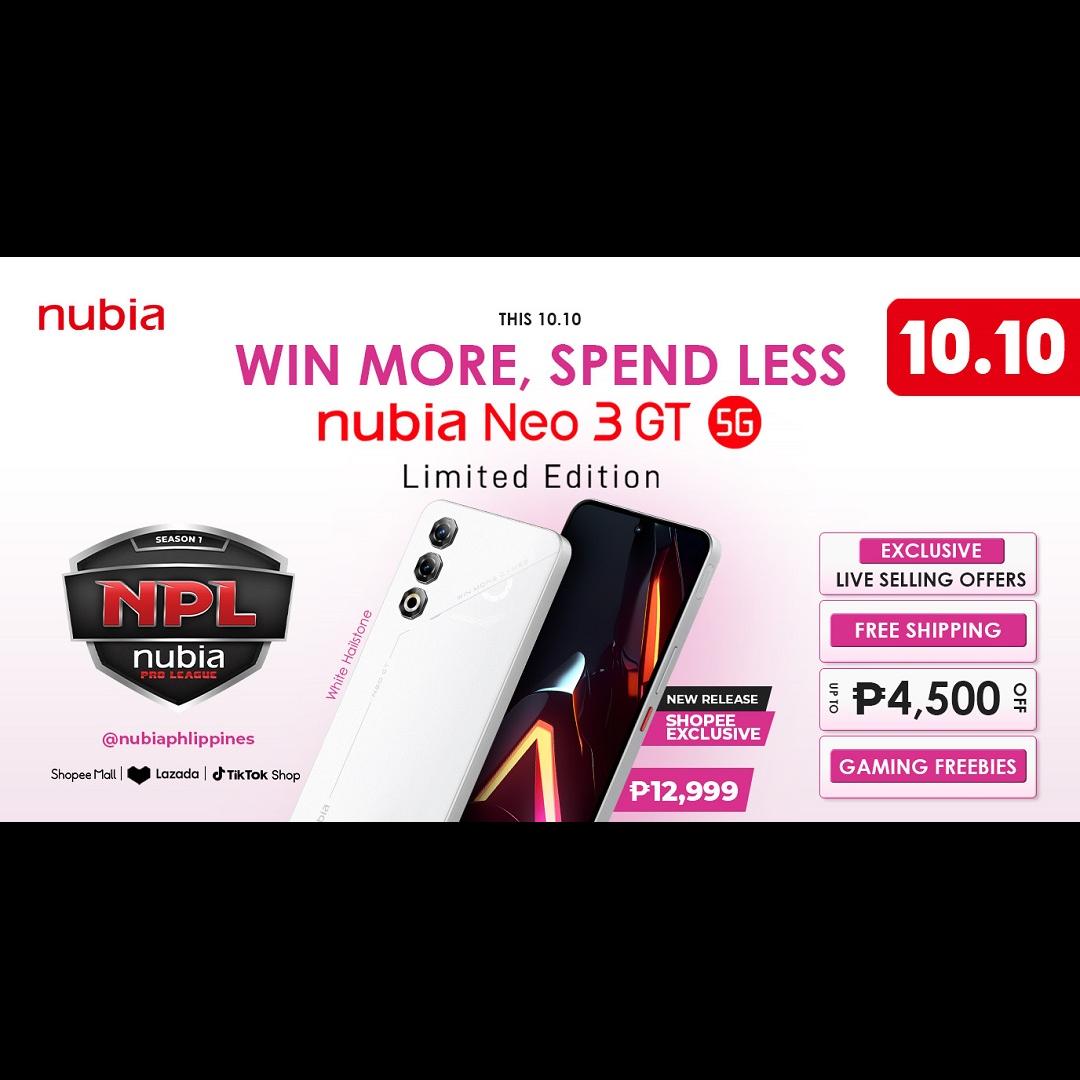 nubia is leveling up the gaming experience in the Philippines with three big announcements this October: the release of the nubia Neo 3 GT 5G Limited Edition, the launch of the first-ever nubia Pro League (NPL) tournament, and exciting 10.10 Mega Sale offers featuring big discounts across the nubia Neo 3 series.