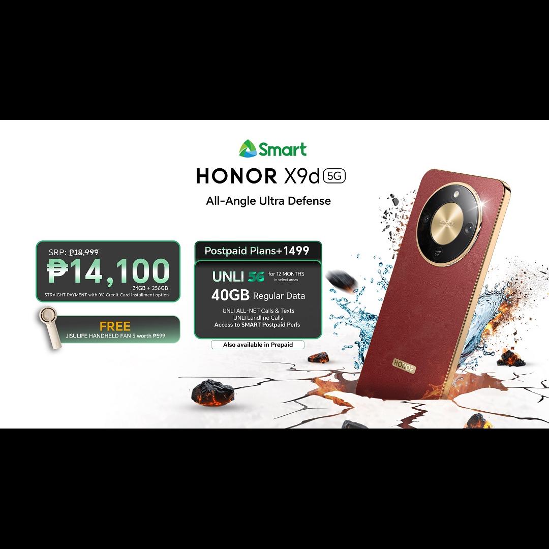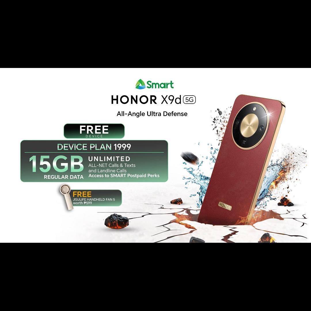 Aside from Smart Postpaid Device Plan 1999, the HONOR X9d 5G will also be available via Smart Postpaid Plans+ 1499 with a ₱14,100 one-time cash out. The plan comes with 40GB of data, Unlimited 5G for 12 months in select areas, unlimited calls and texts, unlimited landline calls, and access to Smart Postpaid Perks—plus a FREE Jisulife Handheld Fan 5.