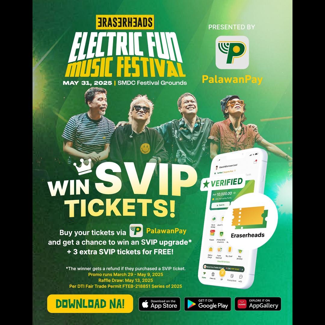 Great news for Eraserheads fans: PalawanPay is giving you first dibs on the much-anticipated concert happening on May 31, 2025, at the SMDC Festival Grounds! An even sweeter deal that will surely take you to Alapaap: all tickets purchased through PalawanPay from March 29 to April 16 come with a 5% discount! Yes, regardless of ticket tier!