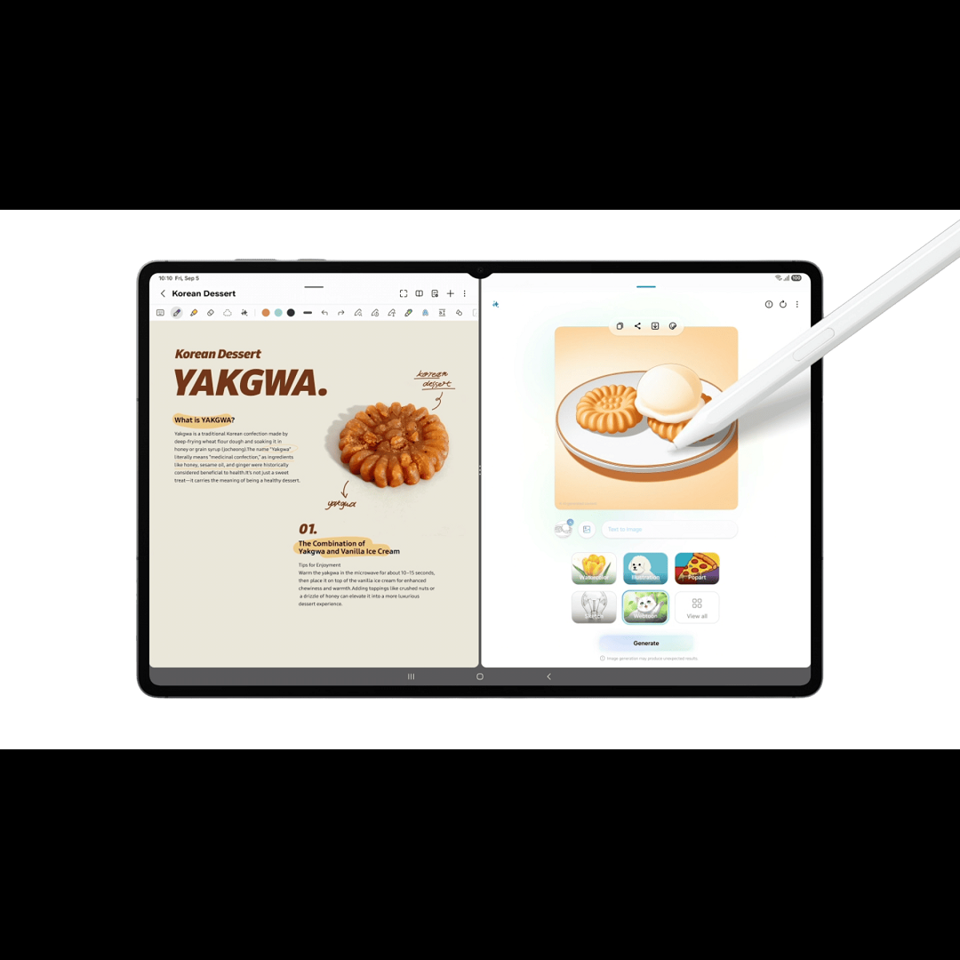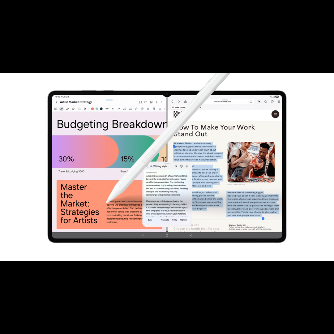 The S Pen comes with both the Galaxy Tab S10 Lite and Galaxy Tab S11 series, delivering a smooth, responsive writing and sketching experience right out of the box. On the Galaxy Tab S11 Series, it has been elegantly redesigned with a sleek hexagonal grip and a precision cone tip, offering even greater control for natural writing and professional-grade creativity. Paired with Quick Tools for instant, floating edits and Sticky Note for capturing ideas right in Samsung Notes, these tablets are built to keep your creativity sharp and flow uninterrupted.