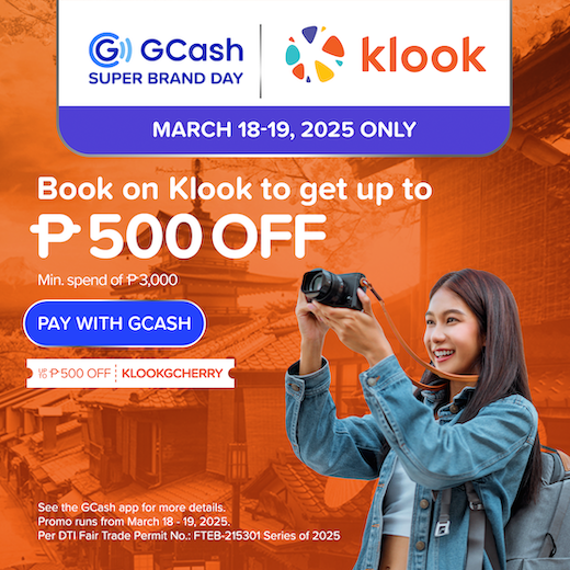 If you want to experience any of the above tours and activities, book your desired activity on Klook and get up to ₱500 off with a minimum purchase of ₱3,000 when you choose GCash as your payment method! From March 18-19, use the code KLOOKGCHERRY at checkout to unlock the discount. You can also book your chosen Klook activities and enjoy 0% installment plans with GGives.
