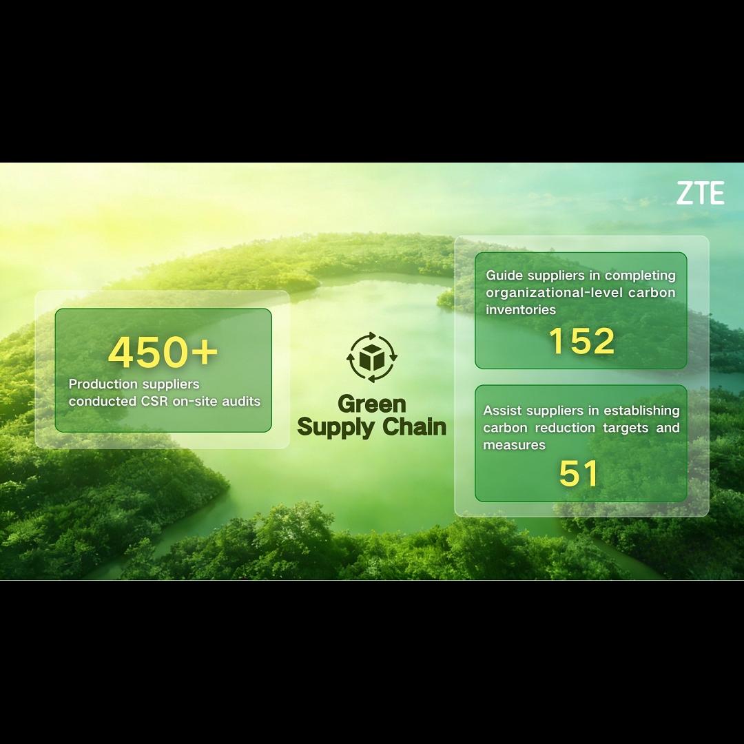 For Green Supply Chain, ZTE has integrated green innovation strategy requirements into supplier management IT systems, including agreement signing, on-site audits, and performance assessments. To date, the company has conducted Corporate Social Responsibility on-site audits for over 450 production suppliers, guided 152 suppliers in completing organizational-level carbon inventories, and assisted 51 suppliers in establishing carbon reduction targets and measures.