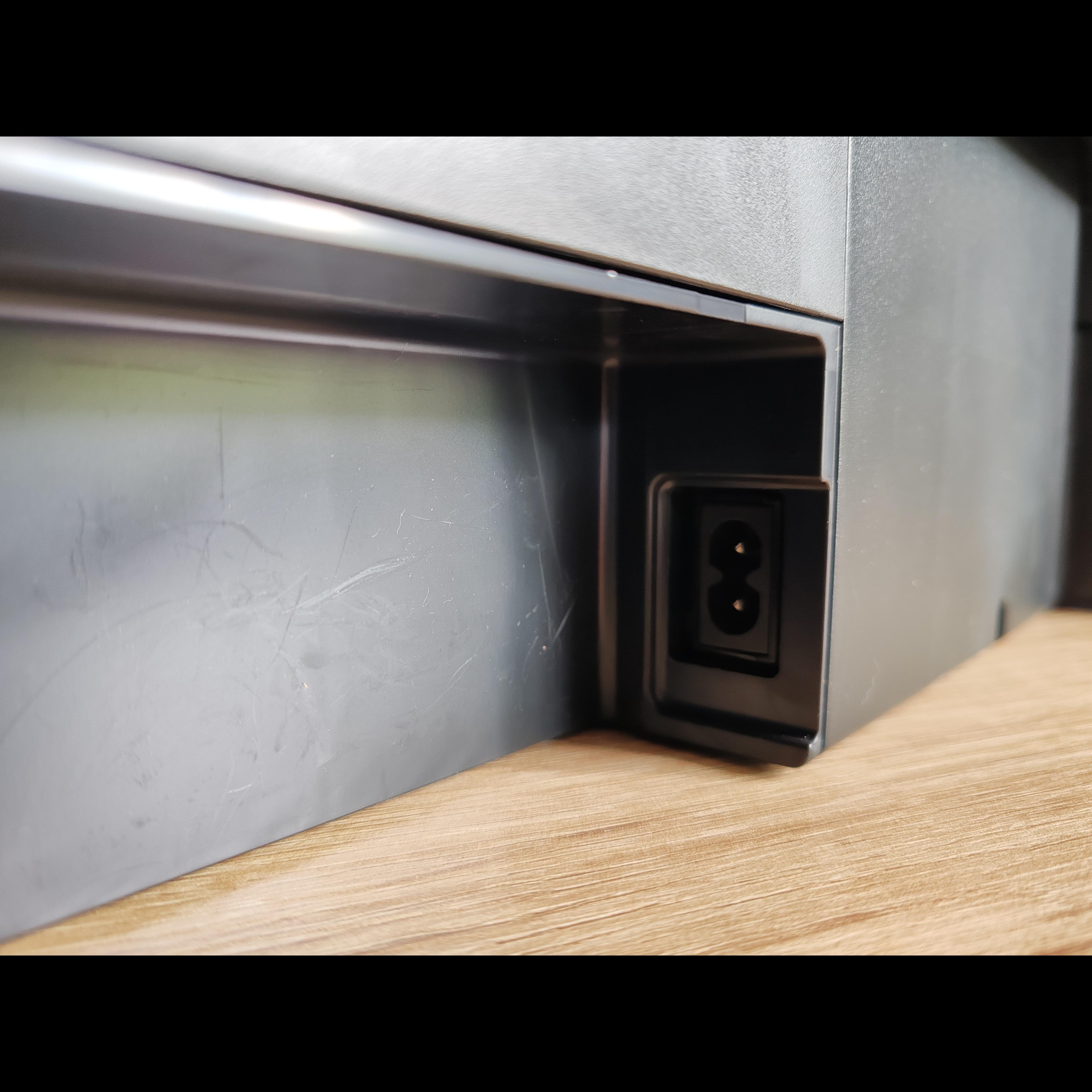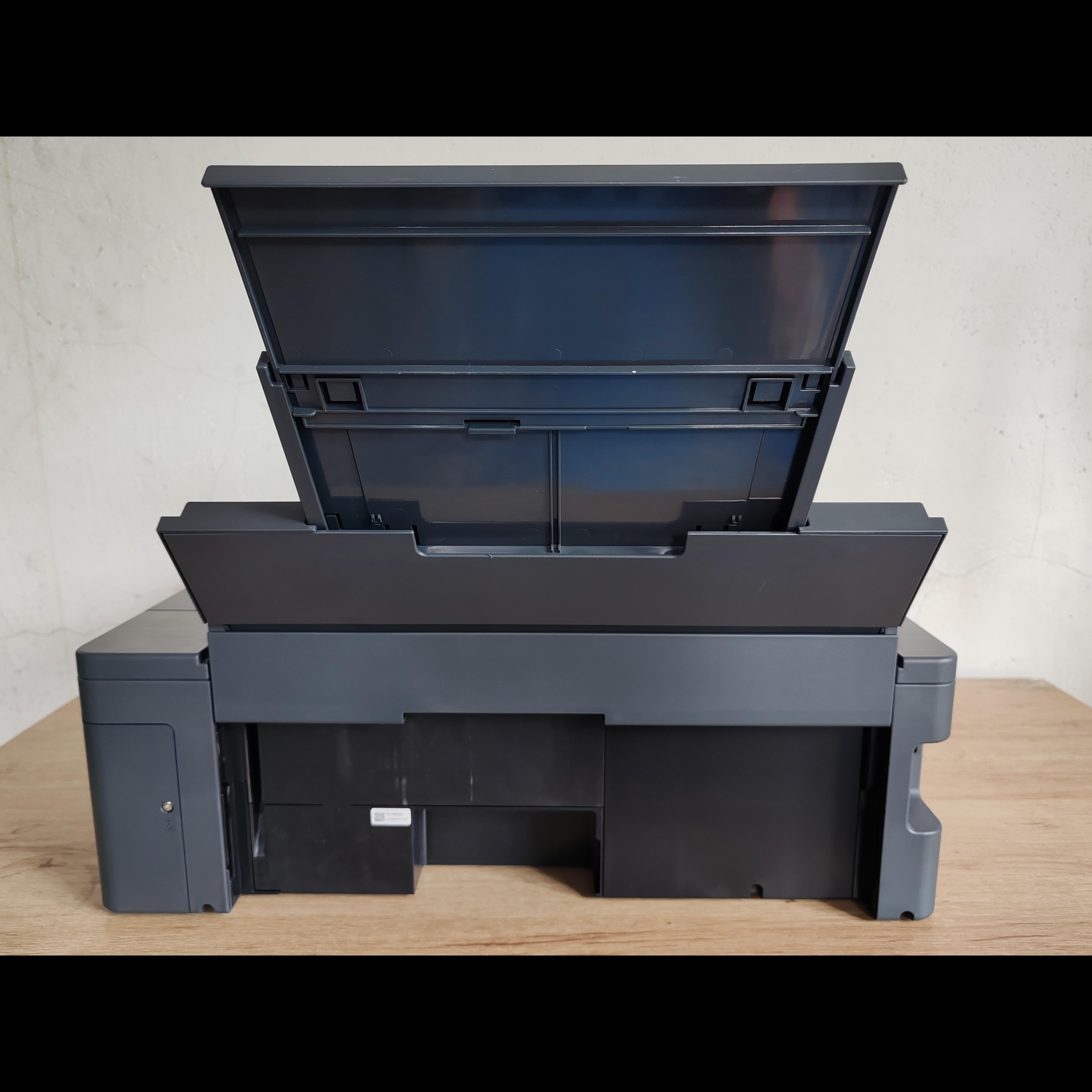 Measuring 498 mm × 358 mm × 165 mm and weighing 6.4 kg, the Epson EcoTank L11050 is a compact A3 printer (40% more compact than its predecessor, according to Epson) that has a matte-black exterior, making it easy to install in any work environment. Because it is an A3 printer, the Epson EcoTank L11050 has a paper support and an output tray that are noticeably larger and longer when fully extended. In the control panel, touch-sensitive buttons consist of the power button, the Wi-Fi button for Wi-Fi Direct (IEEE 802.11b/g/n) setup, and two more buttons for printer maintenance: the third button is for printing detailed network settings and connection status, while the fourth button is for cleaning the print head.