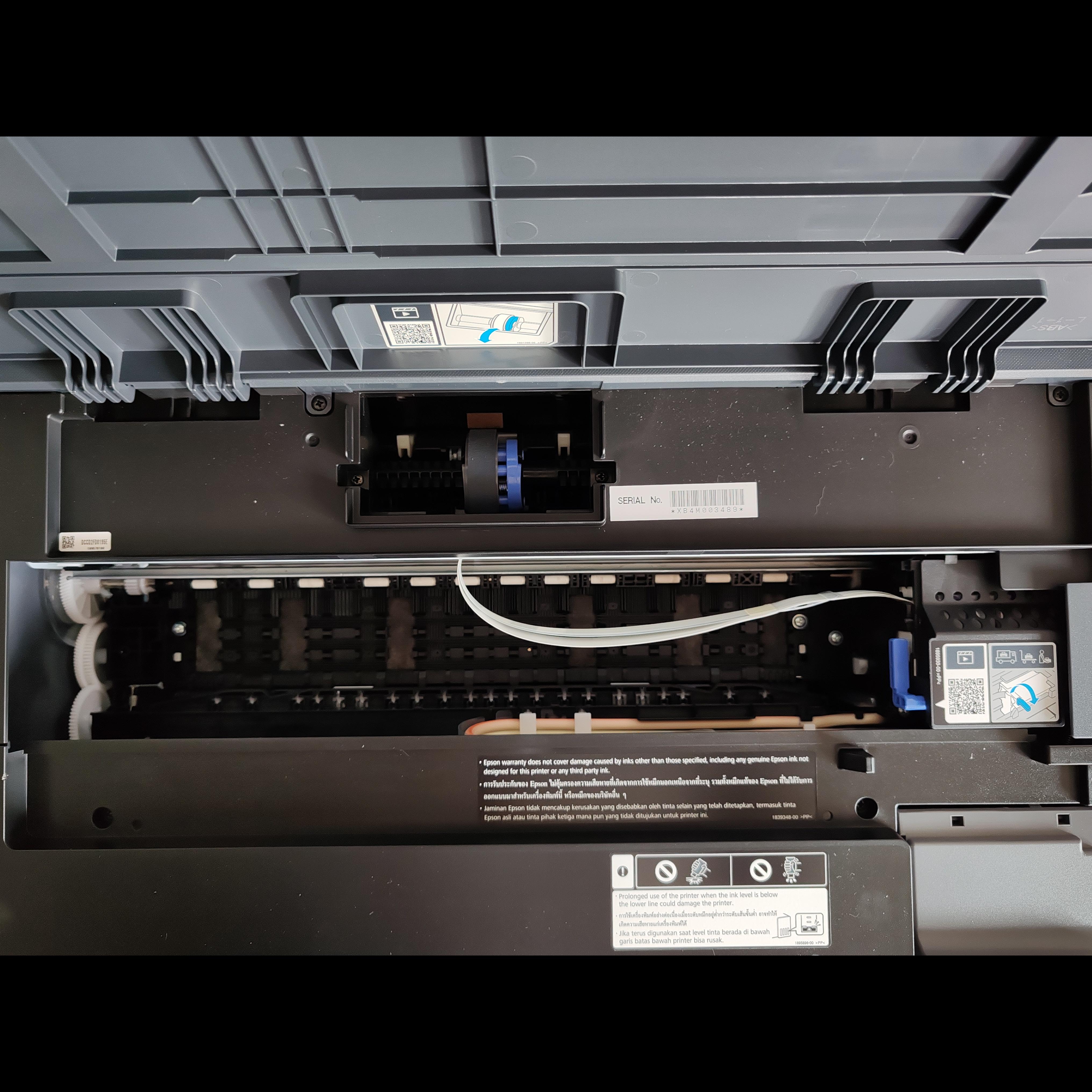The ink tanks (black, cyan, magenta, and yellow) of the Epson EcoTank L11050 are neatly positioned on the right side of the printer and are protected by an ink tank cover. Undoubtedly, this arrangement is much better than those converted to a continuous ink supply system (CISS) wherein ink tanks are exposed to dust and other foreign objects that could harm the printer (note that CISS conversion voids printer warranty). The printer also comes with a transportation lock that blocks ink coming from the ink tanks through the tubes and to the print head. Set the lock to the transport position when moving the printer from one place to another. Spanning across the Epson EcoTank L11050 is the printer cover to protect the print head and other moving parts and prevent foreign substances from entering the printer. At the back, the Epson EcoTank L11050 hosts a USB 2.0 port for computer connection and an AC inlet for power connection.