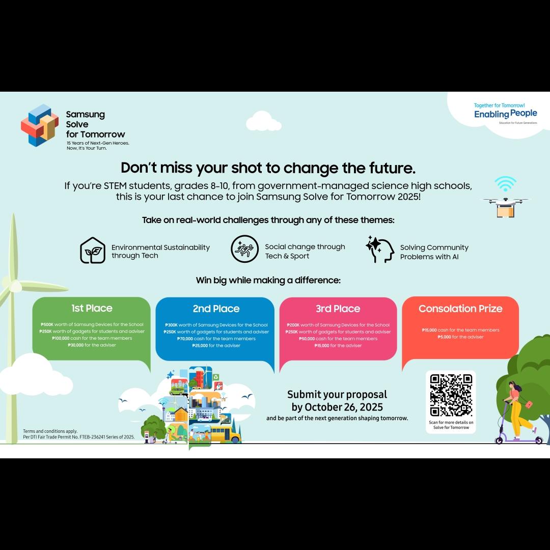 Don’t miss your shot to change the future - win big while making a difference through Samsung’s Solve for Tomorrow! Interested participants can learn more about the program by visiting www.samsung.com/ph/solve-for-tomorrow or following Samsung Philippines on social media via Facebook (facebook.com/SamsungPH), X (x.com/SamsungPH), and Instagram (instagram.com/samsungph).